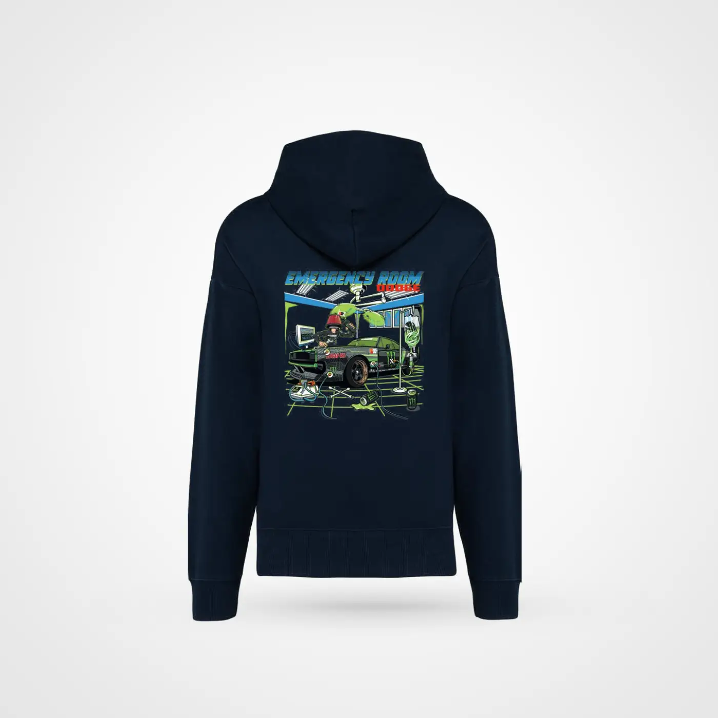 Sa coupe loose maîtrisée et son molleton épais avec intérieur doux garantissent chaleur et confort, tandis que le logo poitrine “Emergency Room Dodge” évoque l’univers des blocs d’urgence et de la vitesse extrême. Au dos, un visuel grand format stylisé de la Charger, version racing, affirme ton amour des muscle cars et du style brutal US. La capuche doublée et les finitions premium complètent ce sweat pensé pour les passionnés de puissance et d’attitude.